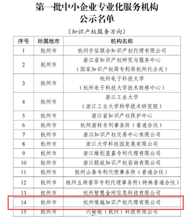 - 喜報!!關于杭州惟越知識產權代理有限公司入選浙江省首批中小企業專業化服務機構的公示